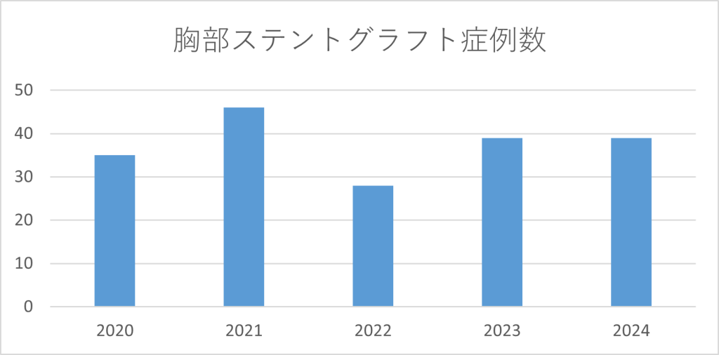 胸部ステントグラフトは、当初は開胸手術が困難なハイリスク症例のみに行われていましたが、短期成績のみならず、長期予後も比較的良いことが明らかとなってきました。そのため手術が可能な方でも、解剖学的にステントグラフトで治療できそうであれば積極的に適応するようになりました。現在では胸部大動脈手術の半数程がステントグラフト治療となってきています。