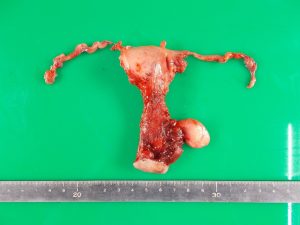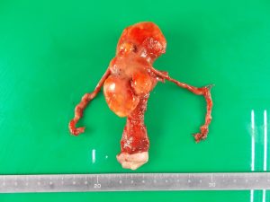 右:経腟的に摘出した頚部筋腫を合併した子宮、両側卵管