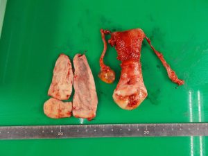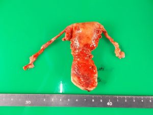 右:経腟的に摘出した子宮、右側傍卵巣嚢胞、両側卵管、後腟壁の粘膜