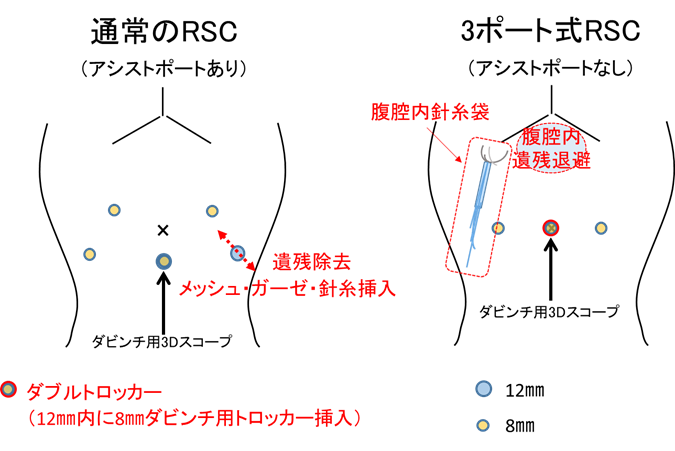 2)3ポート式(3か所の穴)で行います。LSCは臍部12mm、左12mm、右5mmのトロッカー、RSCは臍部12mmに8mmダビンチ用を重ねて、左右とも8mmダビンチ用のトロッカー(通常LSCは4か所の穴、RSCは5か所の穴(アシストポートを併用)で手術をしますが、当科では腟から挿入した自在に固定できる子宮操作鉗子を使用し、さらにRSCでは縫合に必要なメッシュ、縫合糸、ガーゼを、袋にまとめてお腹へ挿入、終了時に袋を回収する方法のため、LSC、RSCのいずれも3ポートで安全な手術が可能です)。